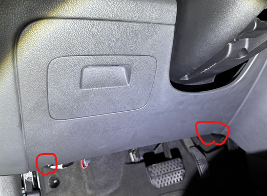 - 브레이크 페달 상단에 있는 브레이크 스위치에 접근하기 위해 운전석 하단 커버를 탈거해야 할 수도 있습니다. 스파크의 경우 보통 별도의 탈거 없이 접근은 가능하지만, 작업의 편의성을 위해 십자드라이버를 이용해 고정 나사를 풀고 커버를 조심스럽게 분리합니다.(하단 2개)
